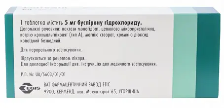 1 таблетка содержит гидрохлорида буспирона 5 мг или 10 мг;