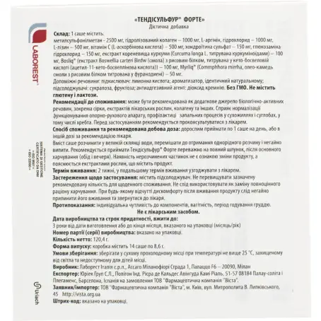 Тендисульфур Форте может быть рекомендован как дополнительный источник биологически активных веществ, в частности серы, экстрактов лекарственных растений, коллагена и других. Способствует нормализации функционирования опорно-двигательного аппарата, профилактике воспалительных процессов в сухожилиях и суставах, в том числе позвоночника, которые могут сопровождаться болевыми ощущениями во время движений.