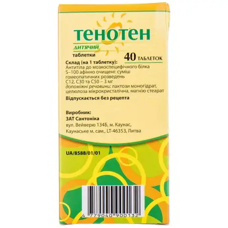Основные физико-химические свойства: таблетки плоскоцилиндрической формы с риской и фаской от белого до почти белого цвета. На одной плоской стороне нанесен риск, на другой плоской стороне нанесена надпись TENOTEN KID.