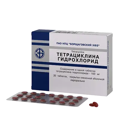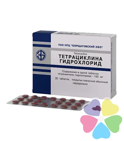 Тетрациклина гидрохлорид 0.1 г – бактериостатическое антибиотическое средство класса тетрациклинов, обладающее широким спектром действия. Препарат действует за счет угнетения белкового синтеза в результате блокировки связывания РНК аминоацил-транспортной с комплексом рибосома-информационная РНК.