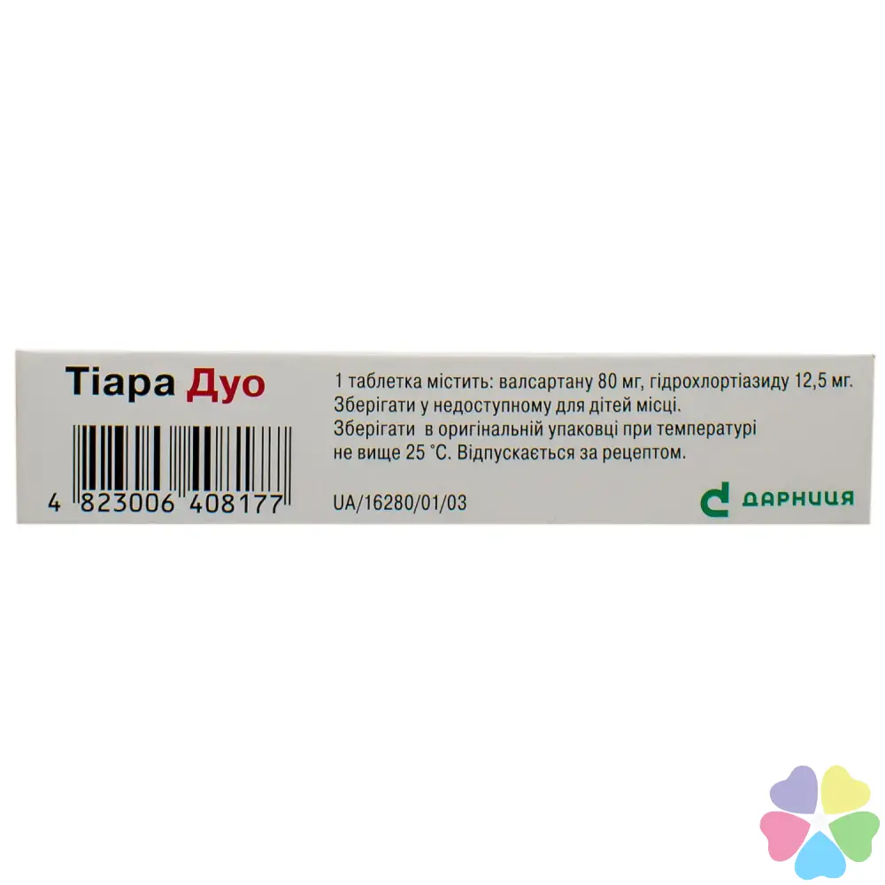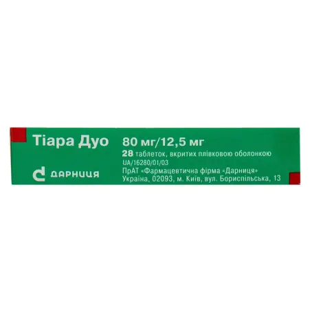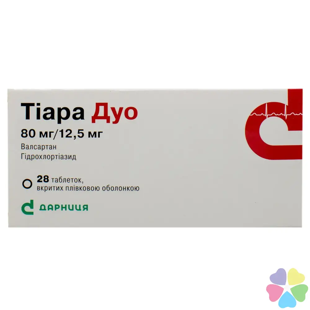 Тиара Дуо 80/12,5 мг: таблетки круглой формы, покрытые оболочкой розового цвета, с двояковыпуклой поверхностью;