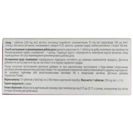 Применять как диетическую добавку к рациону питания взрослых как дополнительный источник селена, который играет важную роль в содействии нормализации функционирования щитовидной железы и обмена веществ в организме человека.