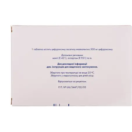 1 таблетка содержит цефуроксим аксетила эквивалентно 250 мг или 500 мг цефуроксима;