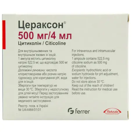 1 ампула содержит цитиколина натрия 522,5 мг, что соответствует 500 мг цитиколина, или цитиколина натрия 1045 мг, что соответствует 1000 мг цитиколина;