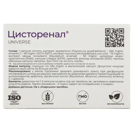 1 капсула содержит экстракт клюквы (Охусоссus guadripetalus) - 200 mg/мг (46.5%*), витамин С - 90 mg/мг (21%*, 120% РДП**), экстракт толокнянки (Arctostaphylos uva-ursi). (Equisetum arvense) – 50 мг/мг (11.6%*); другие составляющие: целлюлоза микрокристаллическая (Е460), кальция стеарат (Е470), кремния диоксид коллоидный (Е551); оболочка капсулы: желатин. Без ГМО. Без глютена.