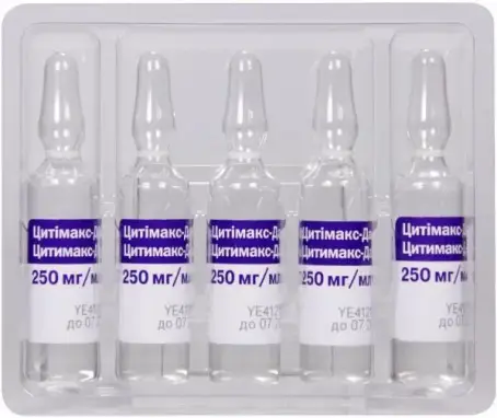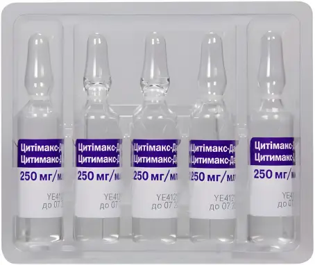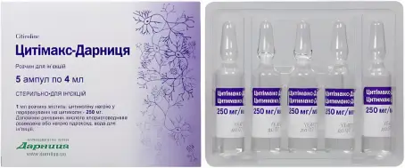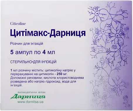 Цитимакс-Дарница 250 мг/мл 4 мл №5 – современный инъекционный медицинский психостимулирующий и ноотропный препарат, растворенный для введения, в ампулах, бесцветных или с желтизной.