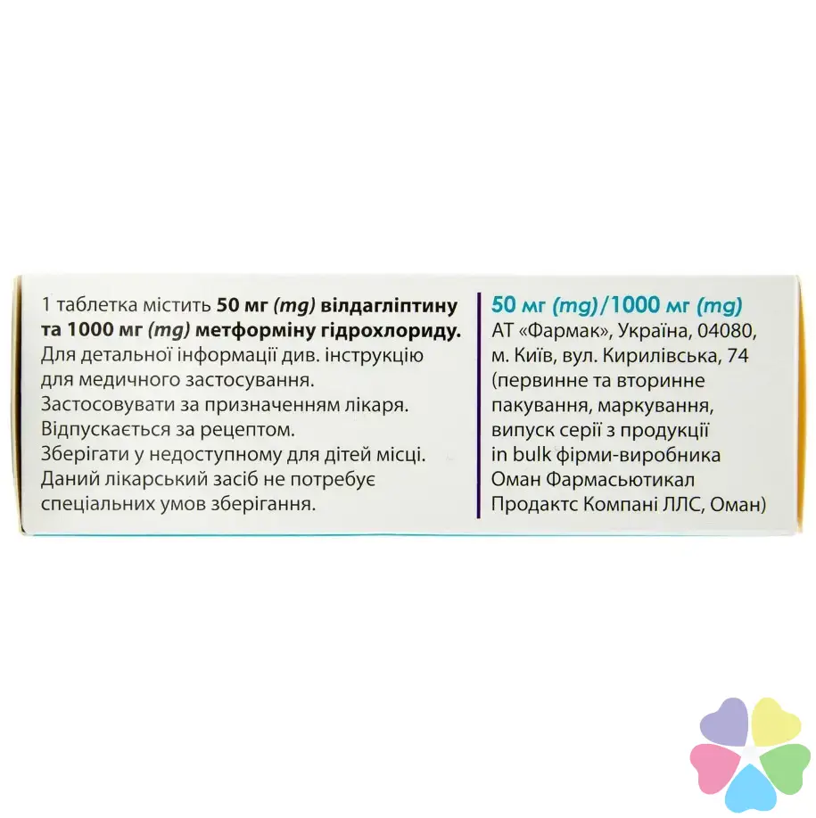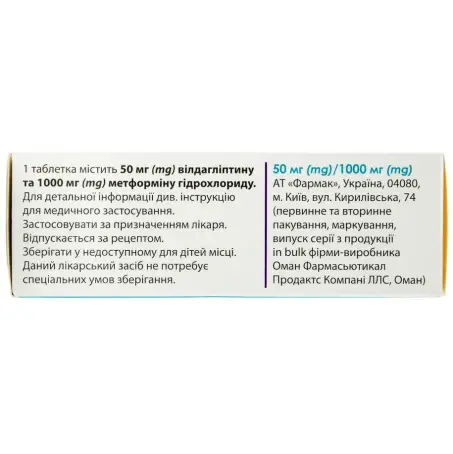 1 таблетка 50 мг/1000 мг містить 50 мг вілдагліптину та 1000 мг метформіну гідрохлориду.