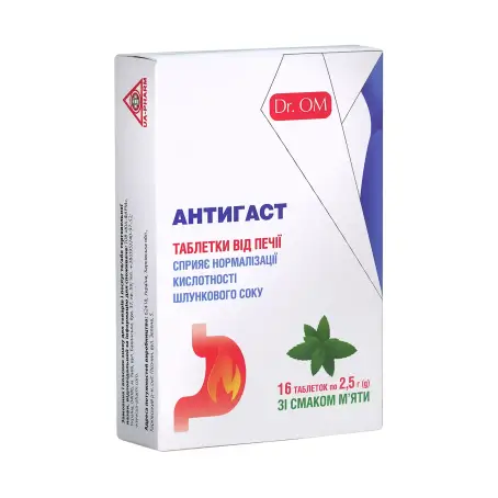 Печія може захопити зненацька або мати хронічну природу — порушення травлення, неправильне положення травних органів, вроджена схильність до підвищеної кислотності. Антигаст Dr. OM з м'ятним смаком допоможе швидко позбавити від неприємних симптомів та нормалізувати кислотність у шлунку. У складі продукту використана комбінація двох антацидів — кальцію карбонату і магнію карбонату. Якщо прийняти таблетку перорально, вона завдає місцевого впливу за рахунок нейтралізації кислоти шлункового соку. Основна складова, карбонат кальцію, потрапляючи в шлунок, нейтралізує соляну кислоту. Карбонат магнію також бере участь у нейтралізації, підсилює ефект карбонату кальцію. Додатково, лимонна кислота має буферні властивості, що дозволяє антацидам нейтралізувати тільки надлишок соляної кислоти. При цьому під час дії Антигасту зберігаються фізіологічні умови травлення та не відбувається вторинної гіперсекреції шлункового соку.