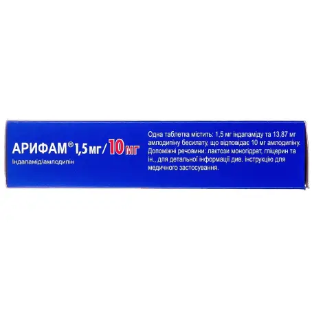 Функція печінки.У пацієнтів з порушенням функції печінки спостерігаються подовження періоду напіввиведення амлодипіну та збільшення значення AUC (площа під кривою на графіку залежності концентрації препарату в крові від часу спостереження); рекомендації щодо дозування відсутні. Тому лікування амлодипіном необхідно розпочинати з найнижчої дози. Препарат слід застосовувати з обережністю на початку лікування та при підвищенні дози. Цільові дослідження з вивчення ефективності комбінованого препарату Арифам за участю пацієнтів з дисфункцією печінки не проводились. Через властивості індапаміду та амлодипіну Арифам протипоказаний пацієнтам з порушенням функції печінки тяжкого ступеня. Пацієнтам з порушенням функції печінки легкого та помірного ступеня препарат слід застосовувати з обережністю.