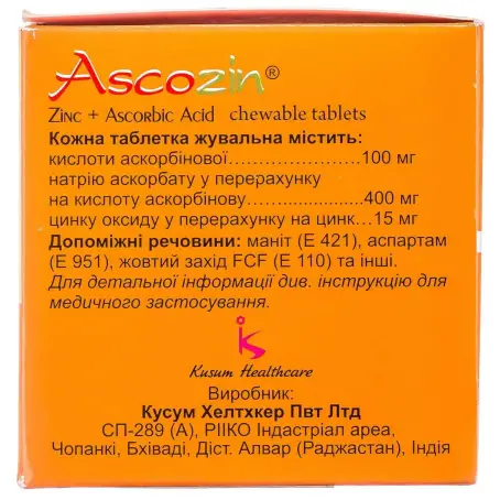 Склад: 1 таблетка містить кислоти аскорбінової 100 мг, натрію аскорбату у перерахуванні на кислоту аскорбінову 400 мг, цинку оксиду у перерахуванні на цинк 15 мг (Acidum ascorbinicum)