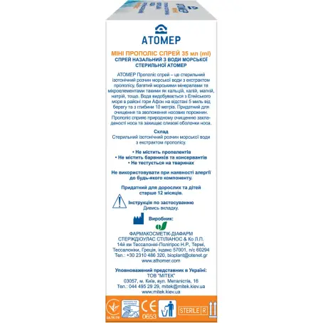 Виріб медичного призначення: АТОМЕР МІНІ ПРОПОЛІС СПРЕЙ ДЛЯ НОСУ З ВОДИ МОРСЬКОЇ СТЕРИЛЬНОЇ (ATHOMER MINI PROPOLIS SPRAY FOR NOSE FROM SEA-WATER STERILE)