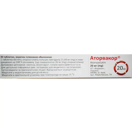 Склад: 1 таблетка містить аторвастатину кальцію тригідрату 21,64 мг в перерахуванні на 100% речовину (що еквівалентно аторвастатину) 20 мг (ATORVASTATINUM)