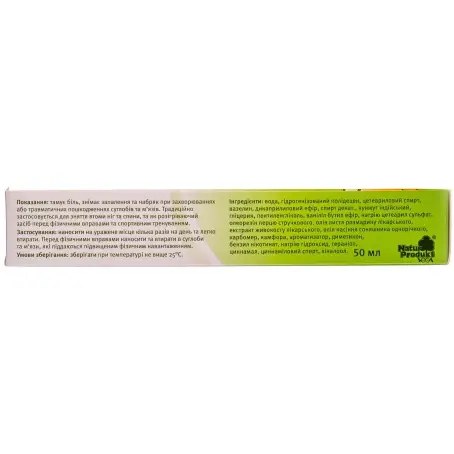 Вода, гідрогенізований полідецен, цетеариловий спирт, вазелін, дікаприліловий ефір, спирт денатурований, кунжут, гліцерин, пентіленгліколь, ваніліл бутил ефір, натрію цетеарил сульфат, олеорезин перцю стручкового, олія листя розмарину лікарського, екстракт живокосту лікарського, масло насіння соняшнику однорічного, карбомер, камфора, ароматизатор, диметикон, бензилнікотинат, натрію гідроксид, гераніол, циннамал, циннаміловий спирт, ліналоол.