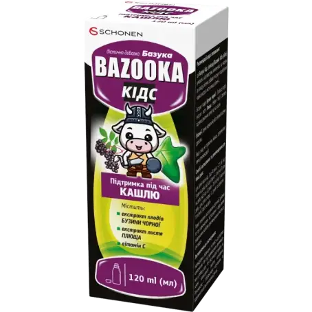 Рекомендації щодо споживання: дія Базука Кідс (еліксир)/Bazooka Kids (elixir) зумовлена особливостями компонентів, що входять до складу дієтичної добавки: екстракт плодів бузини чорної, екстракт листя плюща, вітамін С.
