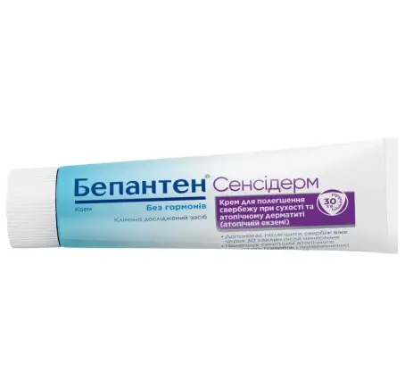 Бепантен® Сенсідерм, крем, призначений для полегшення свербежу та почервоніння, спричинених сухістю шкіри або атопічним дерматитом (атопічною екземою). Бепантен® Сенсідерм, крем, можна наносити кілька разів на день, якщо необхідно, на подразнену непоранену шкіру. Бепантен® Сенсідерм, крем, не містить гормонів.