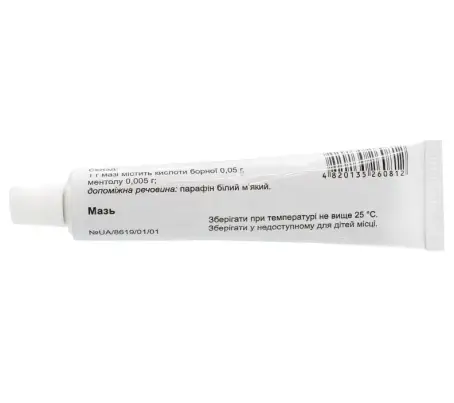 1 г мазі містить кислоти борної 0,05 г, ментолу 0,005 г;