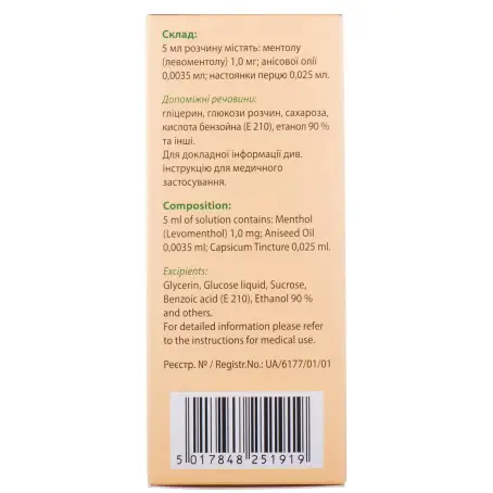 Склад: 5 мл розчину містять: ментолу (левоментолу) 1,0 мг; анісової олії 0,0035 мл; настоянки перцю 0,025 мл (Mentol (levomentol))