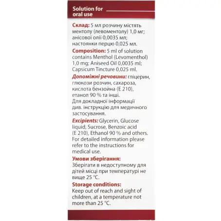 5 мл розчину містять: ментолу (левоментолу) 1,0 мг; анісової олії 0,0035 мл; настоянки перцю 0,025 мл;