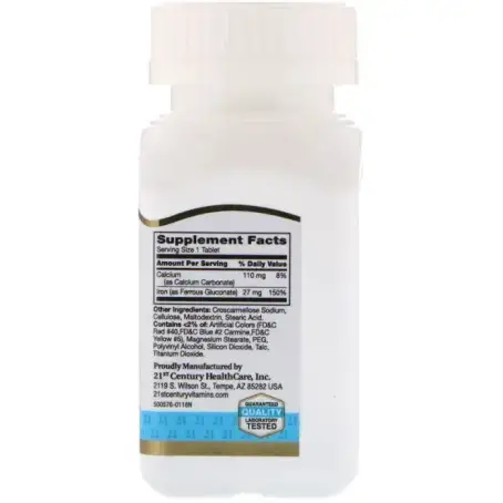 Мінеральна добавка ЗАЛІЗА ГЛЮКОНАТ 27 мг 21CENTURY-ваш помічник для підвищення рівня гемоглобіну в крові, профілактики анемії, підтримки здоров'я волосся і кожних покривів, нормального розвитку організму у вигляді таблеток, які легко ковтаються та в легкозасвоюваній формі глюконату.