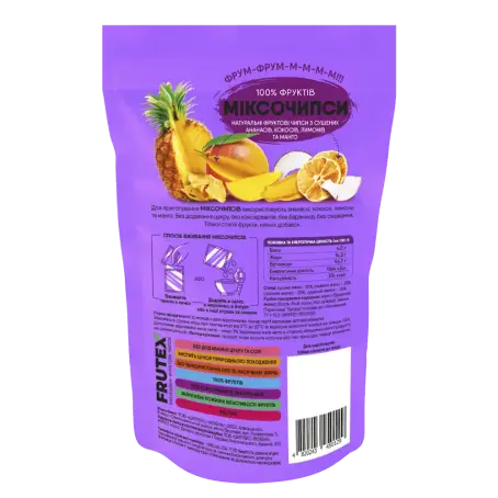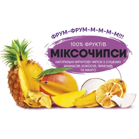 Товщина кожної міксочипси - 0,5-2 мм. Вживайте прямо з пачки або додайте в салат,морозиво,йогурт або в інші страви за смаком. Рекомендовано для дітей від 3 років. Склад: сушене манго - 25%(10г) , сушений кокос - 25%( 10г), сушений ананас - 25% (10г), сушений лимон - 25% (10г). Країна походження сировини: манго (Бразилія), ананас (Коста-Ріка), кокос (Кот-д'Івуар), лимон (Туреччина).