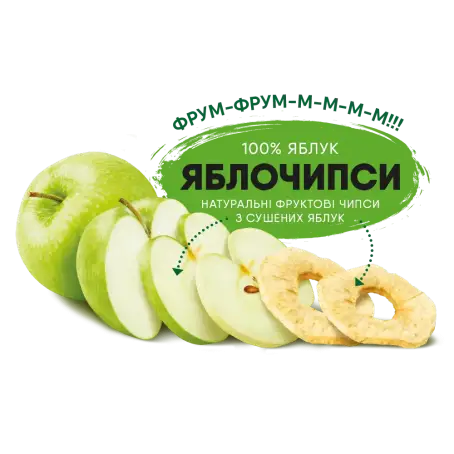 Товщина кожної яблочипси - 3 мм. Вживайте прямо з пачки або додайте в салат, в морозиво, йогурт або в інші страви за смаком!Рекомендовано для дітей від 3 років. Склад: Сушене яблуко - 100%. Країна походження сировини: Україна.