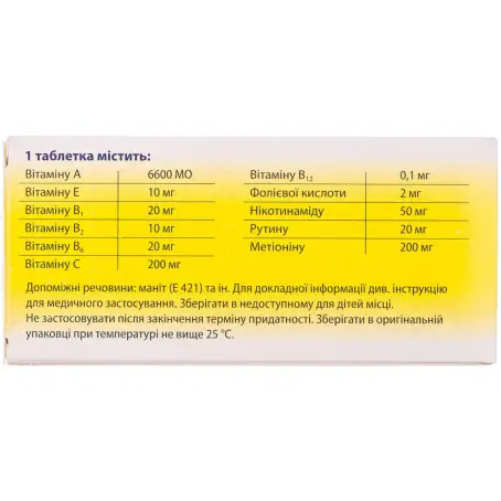 Склад: 1 таблетка містить вітаміну А 6 600 МО, вітаміну Е (-токоферолу ацетату) або сухого вітаміну Е 50% 10 мг, вітаміну В1 (тіаміну гідрохлориду) 20 мг, вітаміну В2 (рибофлавіну) 10 мг, вітаміну В6 (піридоксину гідрохлориду) 20 мг, вітаміну С (кислоти аскорбінової) 200 мг, фолієвої кислоти (вітаміну Вс) 2 мг, нікотинаміду (вітаміну РР) 50 мг, рутину (вітаміну Р) 20 мг, метіоніну 200 мг, вітаміну В12 (ціанокобаламіну) 0,1 мг (RETINOLI ACETAS)