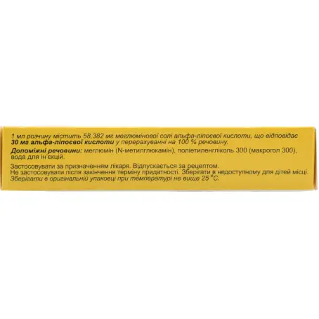 Склад: 1 мл розчину містить меглюмінової солі альфа-ліпоєвої кислоти 58,382 мг, що у перерахуванні на 100% речовину відповідає 30 мг альфа-ліпоєвої кислоти (Acidum thiocticum)