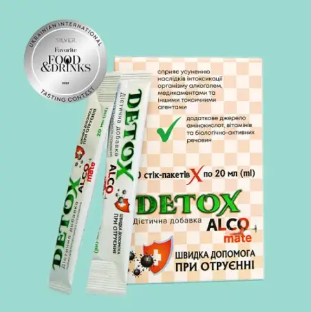 Спосіб споживанняперед споживанням вміст 1 стік-пакета дієтичної добавки ALCO mate DETOX за потреби розвести у ½ склянки (100 мл (ml)) води кімнатної температури.