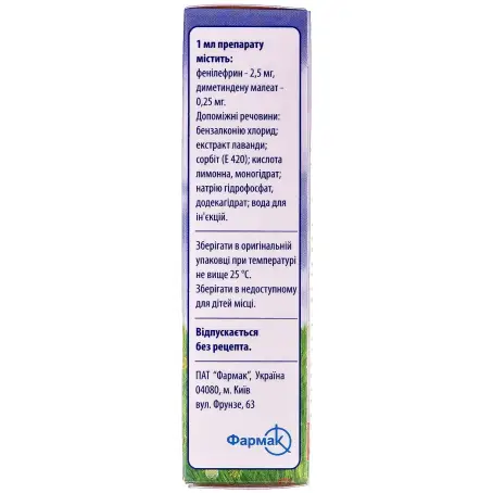 1 мл препарату містить фенілефрину 2,5 мг, диметиндену малеату 0,25 мг;