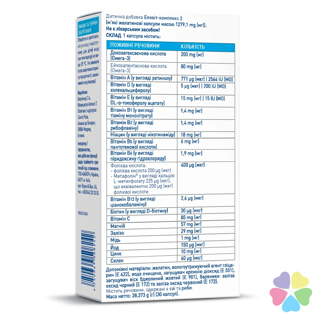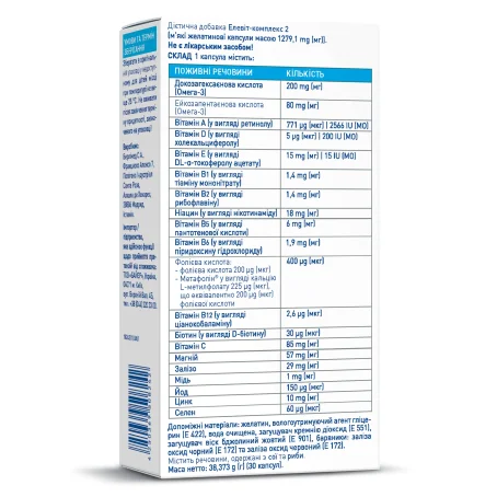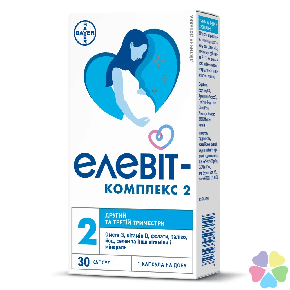 Елевіт-комплекс 2 рекомендований з 2-го триместру вагітності і до народження дитини. Містить 12 вітамінів і 6 мікроелементів, а також омега-3 високого ступеня очищення в 1 капсулі. Сприяє подальшому розвитку серця і мозку дитини.