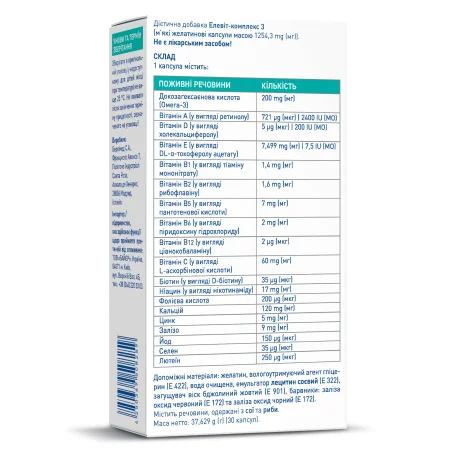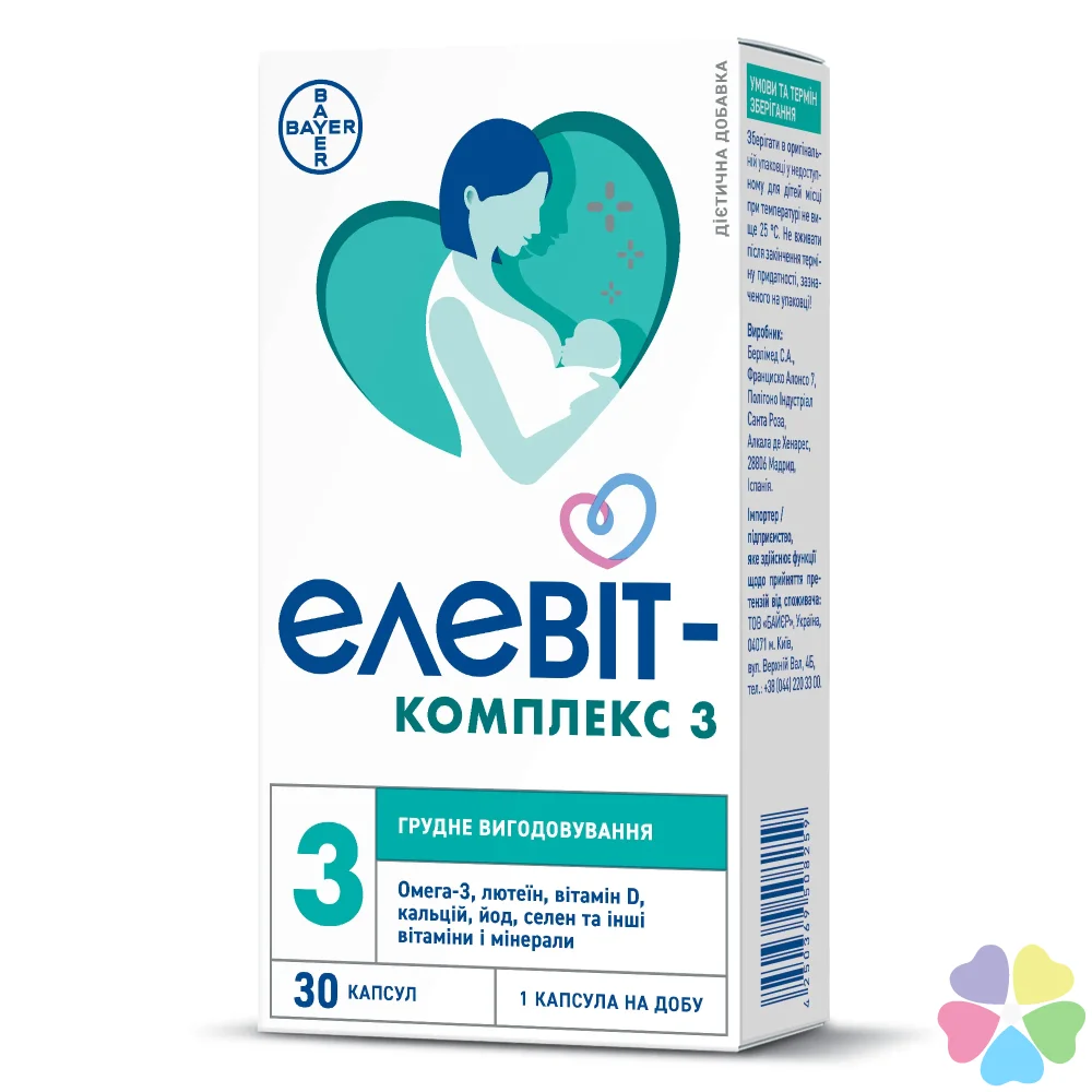 Елевіт-Комплекс 3 містить 12 вітамінів, 5 мінералів, Омега-3 і лютеїн, які є важливими для матері і малюка протягом годування груддю.