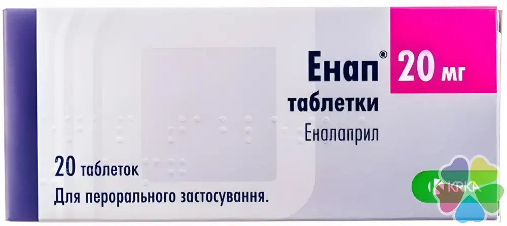 Склад: 1 таблетка містить 20 мг еналаприлу малеату (ENALAPRILI MALEAS)