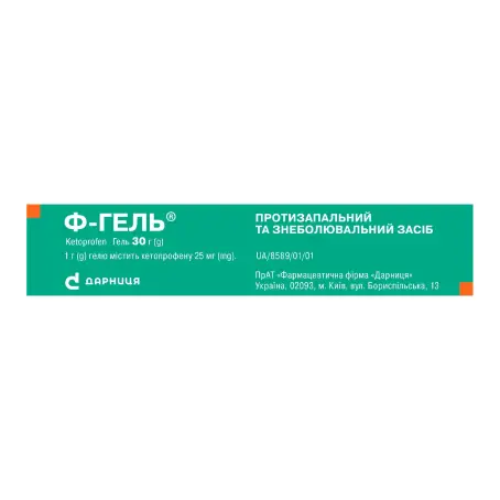 Діюча речовина лікарського засобу - кетопрофен - належить до групи нестероїдних протизапальних засобів, похідних арилпропіонової кислоти. Кетопрофен чинить аналгетичну і протизапальну дію внаслідок гальмування дії циклооксигенази 1 (ЦОГ-1), циклооксигенази 2 (ЦОГ-2) та брадикініну, стабілізації лізосомальних мембран і гальмування міграції макрофагів. Володіє аналгетичною і протизапальною активністю як на ранній стадії (судинній фазі), так і на пізній стадії (клітинній фазі) запальної реакції. Також Ф-гель® гальмує агрегацію тромбоцитів.