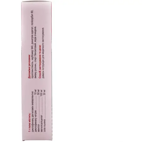 Склад: 1 г гелю містить диклофенаку діетиламіну у перерахуванні на диклофенак натрію 10 мг, ментолу 50 мг, метилсаліцилату 100 мг, олії льняної 30 мг (DICLOFENACUM NATRIUM)