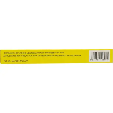 допоміжні речовини:цукроза, лактози моногідрат, какао, повідон К-30, кислота стеаринова, ароматизатор лимонний.