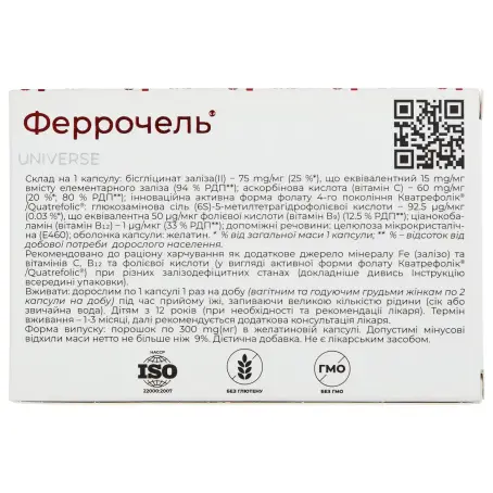 Рекомендації щодо вживання:до раціону харчування як додаткове джерело мінералу Fe (залізо), вітамінів С, В 12 , та фолієвої кислоти (вітамін В 9 , у вигляді активної форми фолату Кватрефолік® /Quatrefolic®) при різних залізодефіцитних станах: підвищена потреба в