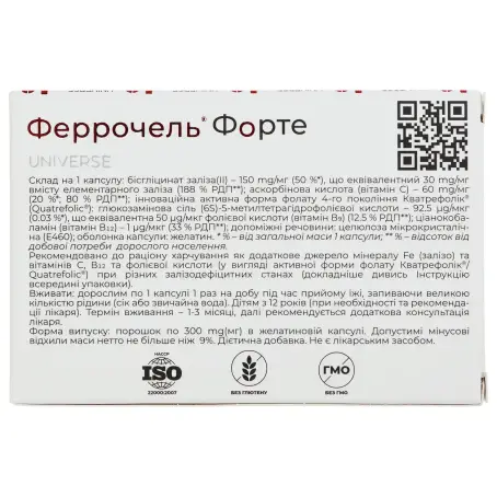 бісгліцинат заліза(II) - 150 mg/мг (50%*), що еквівалентно 30 mg/мг елементарного заліза (188% РДП**); аскорбінова кислота (вітамін С) - 60 mg/мг (20%*; 80% РДП**); інноваційна активна форма фолату 4-го покоління Кватрефолік® /Quatrefolic®: глюкозамінова сіль (6S)-5-метилтетрагідрофолієвої кислоти - 92.5 µɡ /мкг (0.03%*), що еквівалентно 50 µɡ/мкг фолієвої кислоти (вітамін В 9 , 12.5% РДП**); ціанокобаламін (вітамін В 12 ) - 1 µɡ /мкг (33% РДП**); допоміжні речовини: целюлоза мікрокристалічна (Е460); оболонка капсули: желатин.