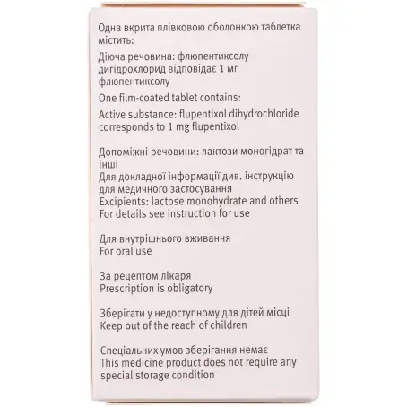 Склад: 1 таблетка містить флюпентиксолу дигідрохлорид відповідно 1 мг флюпентиксолу (FLUPENTHIXOLUM)