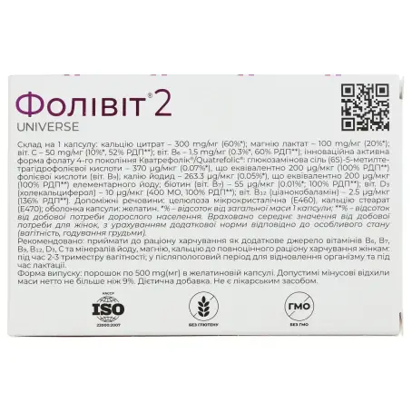 Склад на 1 капсулу: кальцію цитрат - 300 mg/мг (60%*); магнію лактат - 100 mg/мг (20%*); віт. С - 50 mg/мг (10%*, 52% РДП**); віт. В6 -1.5 mg/мг (0.3%*, 60% РДП**); інноваційна активна форма фолату 4 - го покоління Кватрефолік® /Quatrefolic®: глюкозамінова сіль (6S)-5-метилтетрагідрофолієвої кислоти - 370 µg/мкг (0.07%*), що еквівалентно 200 µg/мкг (100% РДП**) фолієвої кислоти (віт. В9); калію йодид - 263.3 µg/мкг (0.05%*), що еквівалентно 200 µɡ/мкг (100% РДП**) елементарного йоду; біотин (віт. В7) - 55 µg/мкг (0.01%*; 100% РДП**); віт. D3 (холекальциферол) - 10 µg/мкг (400 MO, 100% РДП**); віт. В12 (ціанокобаламін) - 2.5 µg/мкг (136% РДП**). Допоміжні речовини: целюлоза мікрокристалічна (Е460), кальцію стеарат (Е470); оболонка капсули: желатин.
