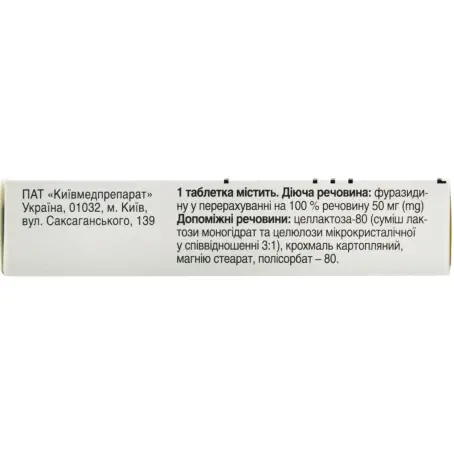 діюча речовина:1 таблетка містить фуразидину, у перерахуванні на 100% речовину 50 мг;допоміжні речовини: целлактоза-80 (суміш лактози моногідрату та целюлози мікрокристалічної у співвідношенні 3:1),крохмаль картопляний, магнію стеарат, полісорбат-80.