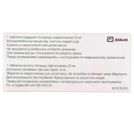 діюча речовина: 1 таблетка містить 50 мг ітоприду гідрохлориду;