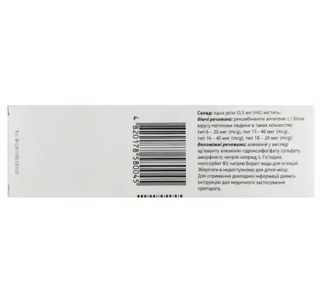 Одна доза (0,5 мл) містить:діючі речовини: рекомбінантні антигени: L1 білок вірусу папіломи людини в наступних співвідношеннях: тип 6 (20 мкг), тип 11 (40 мкг), тип 16 (40 мкг), тип 18 (20 мкг);