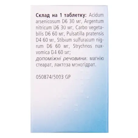 Склад: 1 таблетка містить: Acidum arsenicosum D6 - 30 мг, Argentum nitricum D6 - 30 мг, Carbo vegetabilis D6 - 60 мг, Pulsatilla pratensis D4 - 60 мг, Stibium sulfuratum nigrum D6 - 60 мг, Strychnos nux-vomica D4 - 60 мг (Argentum nitricum D6)