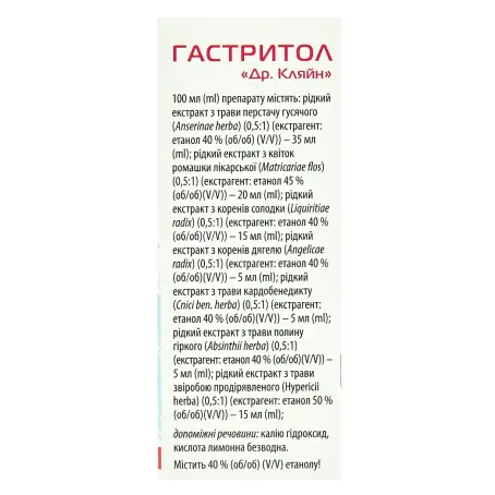 рідкий екстракт з трави перстачу гусячого (Anserinae herba) (0,5:1) (екстрагент: етанол 40% (об/об)) - 35 мл; рідкий екстракт з квіток ромашки лікарської (Matricariae flos) (0,5:1) (екстрагент: етанол 45% (об/об)) - 20 мл; рідкий екстракт з коренів солодки (Liquiritiae radix) (0,5:1) (екстрагент: етанол 40% (об/об)) - 15 мл; рідкий екстракт з коренів дягелю (Angelicae radix) (0,5:1) (екстрагент: етанол 40% (об/об)) - 5 мл; рідкий екстракт з трави кардобенедикту (Cnici ben. herba) (0,5:1) (екстрагент: етанол 40% (об/об)) - 5 мл; рідкий екстракт з трави полину гіркого (Absinthii herba) (0,5:1) (екстрагент: етанол 40% (об/об)) - 5 мл; рідкий екстракт з трави звіробою продірявленого (Hypericii herba) (0,5:1) (екстрагент: етанол 50% (об/об)) - 15 мл;