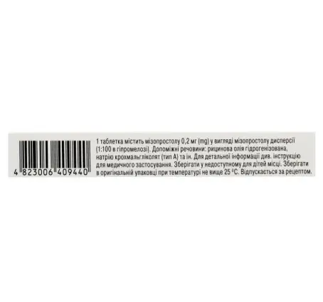 1 таблетка містить мізопростолу 0,2 мг у вигляді мізопростолу дисперсії (1:100 в гіпромелозі);