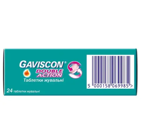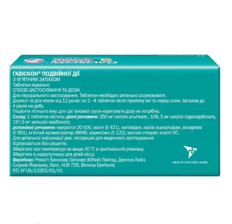 Гавіскон Подвійної дії, таблетки. Таблетки слід ретельно розжовувати. Дорослі та діти віком старше 12 років: по 2-4 таблетки після їжі та перед сном, всього до 4 разів на добу.