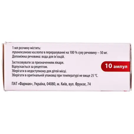 Склад: 1 мл розчину містить транексамової кислоти у перерахуванні на 100% суху речовину 50 мг (ACIDUM TRANEXAMICUM)