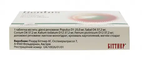 діючі речовини: 1 таблетка містить: Populus D1 25,0 мг, Sabal D6 37,2 мг, Conium D6 37,2 мг, Kalium iodatum D12 37,2 мг, Ferrum picrinicum D12 37,2 мг;