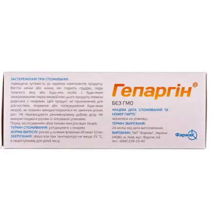 - Іони цитрату, що містяться в Гепаргіні®, сприяють процесу травлення при підвищеній кислотності шлункового соку, cприяють зменшенню ацидозу та диспептичних проявів (нудота, відчуття тяжкості в шлунку, метеоризм), які часто спостерігаються при захворюваннях печінки.