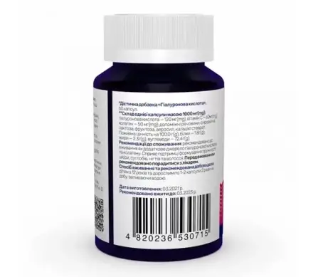 Зволоження шкіри: гіалуронова кислота здатна утримувати велику кількість вологи (до 1000 разів своєї ваги), що робить її дієвим інгредієнтом для зволоження шкіри і підтримки її молодого вигляду.